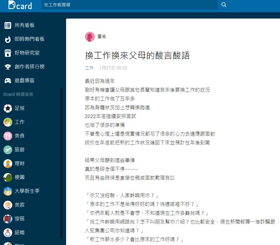 女子表示,原本的工作做了5年多,但因為身體的狀況從去年底開始安排面試,最近過年終於有機會把換工作的事告知家人。為了轉換跑道,女子不管是心理上還是現實情況都花了很多的心力去適應跟面對,終於在年底前把新的工作狀況確認下來並預計在年後到職。