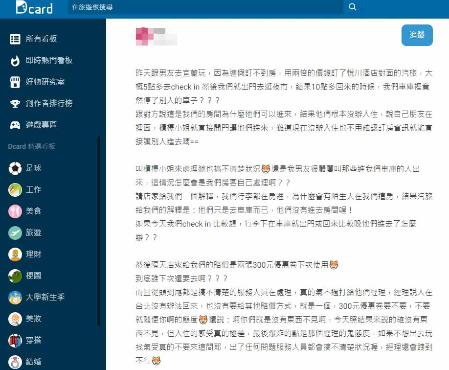 女子問櫃台,結果櫃台說不清楚狀況,「還是我男友很嚴厲叫那些進我們車庫的人出來,這情況怎麼會是我們房客自己處理啊?」他們請旅館給一個解釋,畢竟行李都在二樓房間,但卻有陌生人出現,結果旅館竟然回:「他們只是去車庫而已,他們沒有進去房間喔!」讓女子無法接受這樣的答案,女子認為「如果今天我們check in 比較趕,行李下在車庫就出門或回來比較晚他們進去了怎麼辦?」