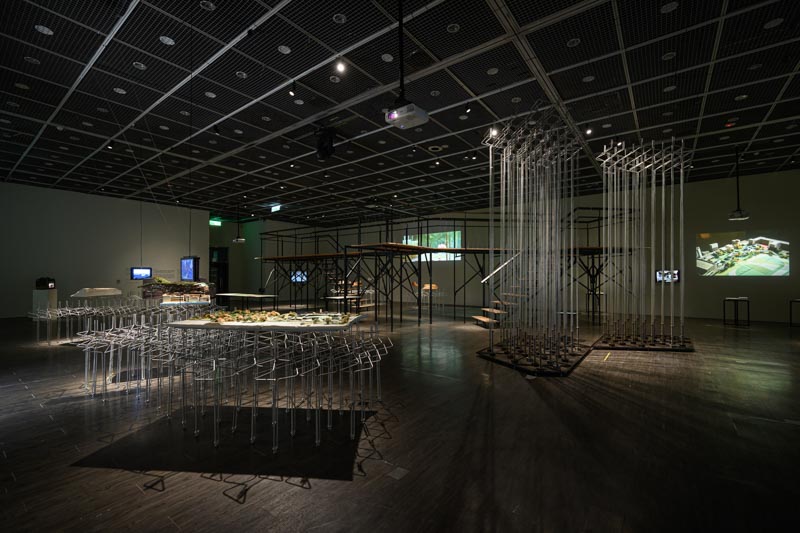 《Together》位於二樓最大展間,以田中央強調建築是集體表現的形式,打造一座架高階梯平台,觀眾可隨著導引路徑自然遊走,登高俯瞰整個展場或是沉浸觀賞七位藝術家與田中央的影片、模型、作品等,彼此穿越逐步互相滲透展開新的關係,在這開放的空間狀態中,召喚出真正together共同生活的社群本質。