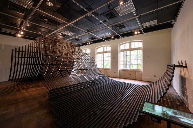 擅於展場空間詮釋的建築家林聖峰,以無數鋼條交織出的兩片曲面恣意地舒展在這紅磚空間,搭構出觀眾可不受限佇立、行走,或在曲面上坐臥的體驗空間《形成》,打開前所未有的知覺交流,傳遞出田中央建築對於自由、開放與探索的理念。