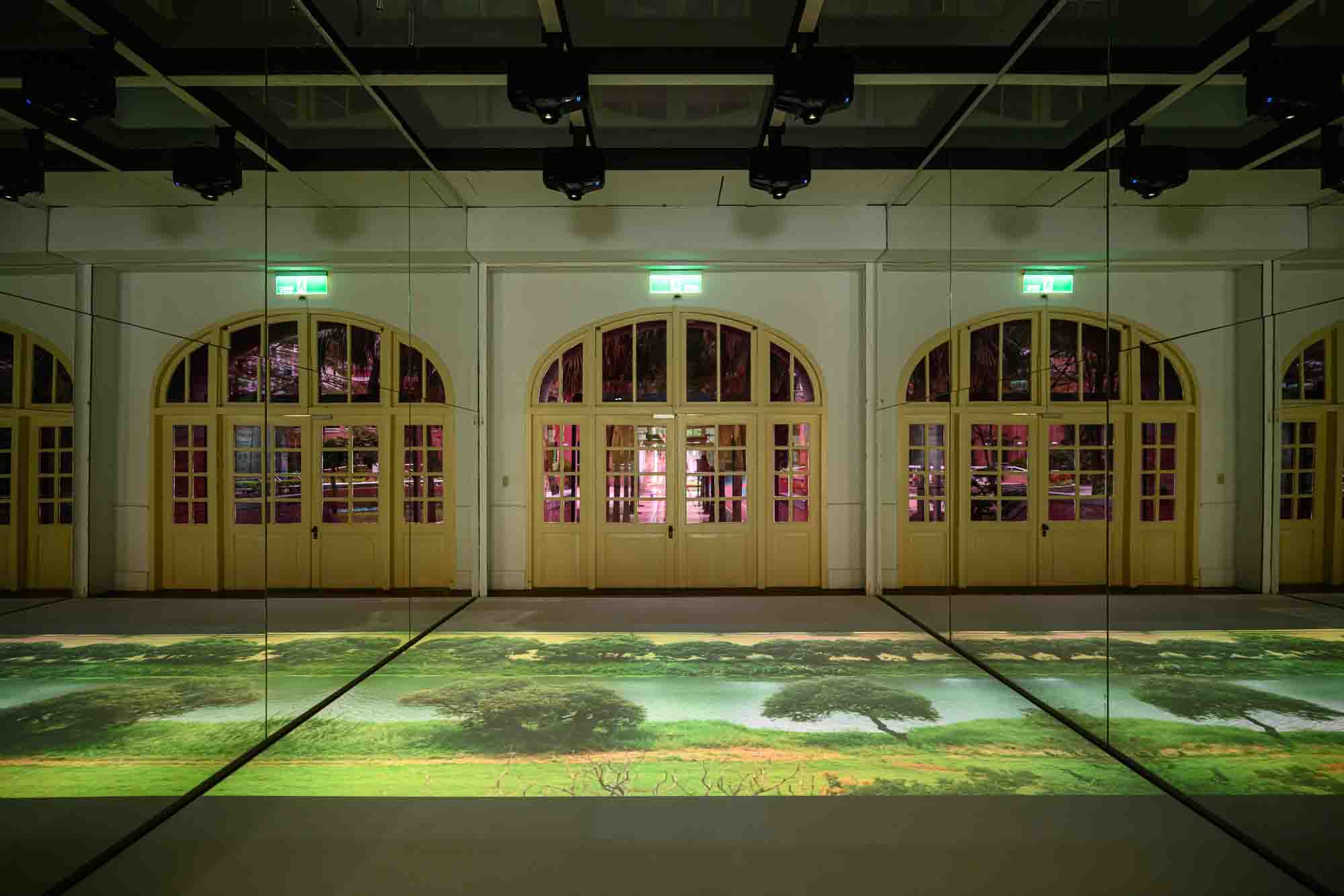 行至二樓的樓梯間播映導演蔡明亮拍攝田中央「壯圍沙丘旅遊服務園區」與周圍的自然生態為背景的第八部行者作品《沙》,身著紅色袈裟的行者踽踽而行,在陰灰天空下迎著冷冽的東北風,慈悲而堅定。行者緩緩踏出一步,和上下樓梯觀者的心跳共鳴著。《宜蘭》紀錄片是蔡明亮拍攝南館市場、城隍廟的早餐店、復興路的燒餅店、宜蘭的山水和稻田的日常影像,呼應田中央建築深受宜蘭地貌風土與人情牽引。