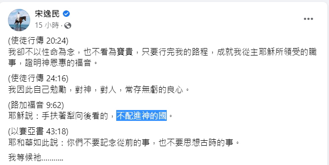 宋逸民沉寂了幾天,就在社會大眾稍微淡忘他的名字時,他又跳出來吸引大家的目光,而且又是藉主之名,PO了幾段聖經內容,卻被有些人認為他是在指桑罵槐,引用聖經來批評小甜甜。