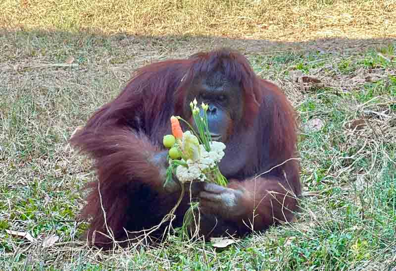 ▲紅毛猩猩「咪咪」專注研究特製花束的吃法。紅毛猩猩「咪咪」的花束由花椰菜、韭菜花、四季豆、蜜棗及胡蘿蔔組成,室友「阿宏」拿到火焰木花想送給咪咪,但咪咪卻手握蔬果花束轉身離開,並在一旁研究沒見過的韭菜花,完全不給阿宏機會。