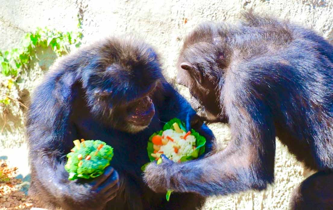 黑猩猩「莉忠」率先找到園方準備的火焰木花束,嚐了一口甘甜的花蜜後發現另一頭還有鑲上芭蕉、金棗、蜜棗和蘋果的花椰菜,快速走過去拿起來食用,也不忘跟室友「美珍」及「曼華」分享特製花束,讓「猩」居充滿粉紅泡泡;美珍和曼華看到新奇的花束還仔細端詳一番,隨後才開始吃起蔬果花束。