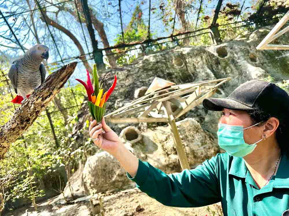 ▲保育員遞上辣椒花束給灰鸚鵡「小灰」。