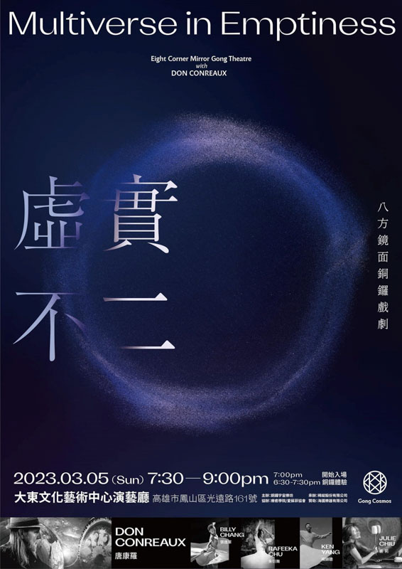 2015年2月Don Conreaux首次來台巡演的第一站,就是在大東文化藝術中心舞蹈排練室舉行90分鍾的銅鑼浴,從此開啟國內銅鑼浴、聲音癒的先鋒,創造了聲音療癒的新局,造就了現今全台各地都有銅鑼浴演出的盛況。睽別八年,Don 2023台灣行的最後一站又再次來到大東文化藝術中心演藝廳登台演出,同時與國內頂尖的表演藝術家楊錦聰、張逸軍與朱衍舞等三位老師共同合作,這必定會再次讓銅鑼表演的型態掀起國內藝術表演界創新風潮。