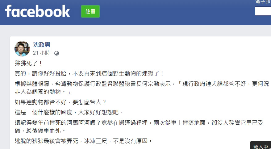 沈政男昨天聽聞狒狒的死訊,相當憤怒,他在臉書無奈發文:「請你好好投胎,不要再來到這個野生動物的煉獄了!」另外他也引用台灣動物保護行政監督聯盟秘書長何宗勳所說過的一句話,那就是:「現行政府連犬貓都管不好,更何況非人為飼養的動物。」