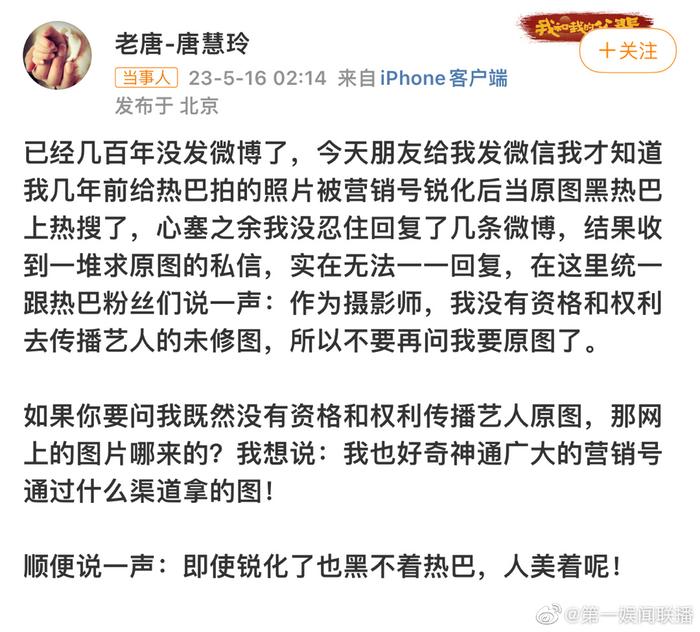 攝影師表示,這是好幾年以前的圖,很多人都希望他能PO真正的生圖來證明迪麗熱巴的美,但她身為攝影師,沒有資格和權力去傳播藝人的生圖,所以希望大家不要再向他要原圖,而且她也很好奇營銷號是怎麼拿到這些圖的,並替迪麗熱巴打抱不平:「即使銳化了也黑不著熱巴,人美著呢!」