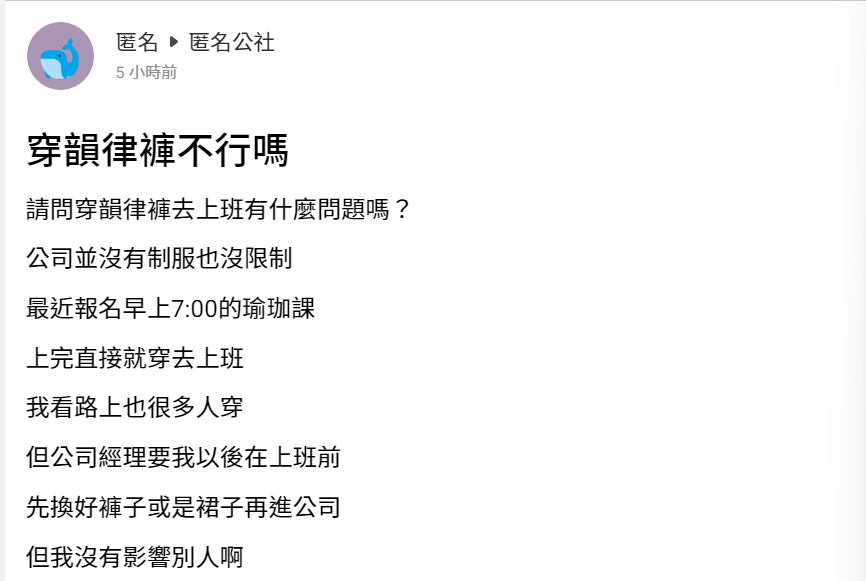 一名女網友在「匿名公社」發文問「穿韻律褲不行嗎?」認為路上也有很多女生穿,她穿韻律褲去上班,卻被經理要求上班前先換褲子或裙子,她自覺沒有影響別人,於是上網抱怨,沒想到網友卻不支持她的看法,一面倒認為經理是對的。