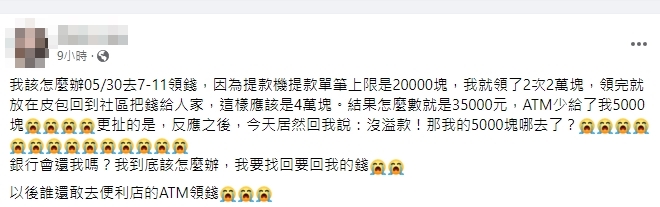 女子今日(6/2)在覽臉書社團爆料公社公開版發文表示,她5月30日到桃園觀音區一間便利商店領錢,分別領了兩次各20000元,「領完就放在皮包回到社區把錢給人家,這樣應該是4萬塊。結果怎麼數就是35000元,ATM少給了我5000塊」。