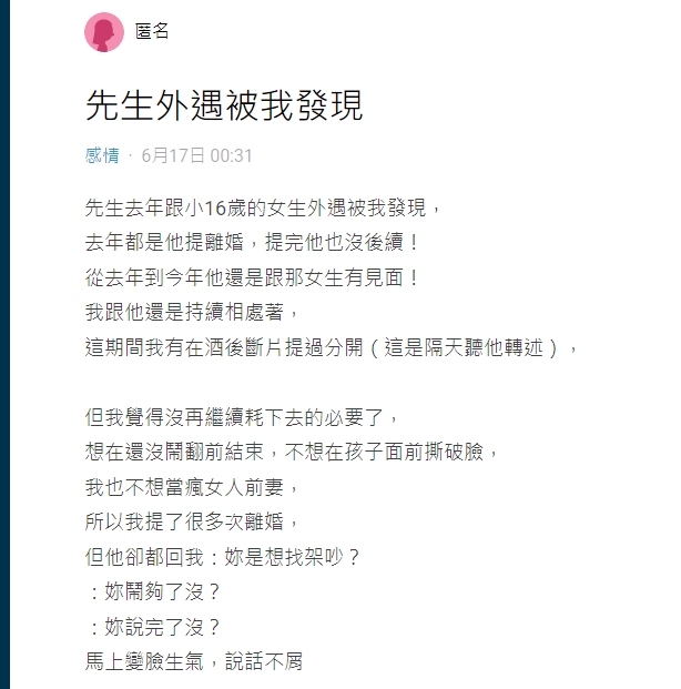 一名女網友在Dcard感情板發文表示,去年發現老公和小16歲的妹子外遇,直到現在他們兩人都還維持見面,自己也多次提過離婚,但老公都沒有答覆,反而回罵:「妳鬧夠了沒?」還威脅她。現在原PO表示小孩再6年就18歲了,不知道要不要繼續和老公耗下去。