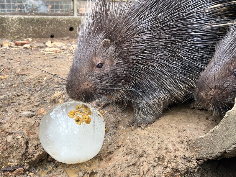 另最喜歡待在水裡泡湯的河馬三朵花「嘟嘟」、「小小」和「香香」,看到園方特製的火龍果冰柱,即刻上岸大口享用,大飽口福後隨即回到水中繼續為皮膚補充水分;善於挖掘且嗅覺極佳的冠豪豬則悠閒地享用鑲上菊花、甘菊葉和玫瑰的水晶球冰。