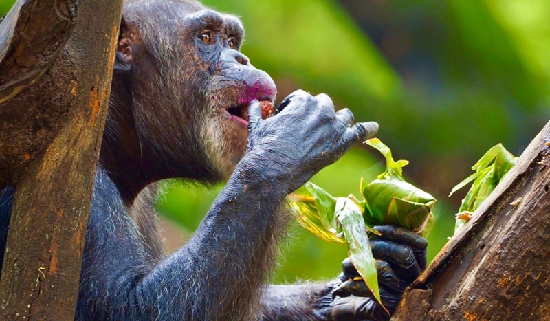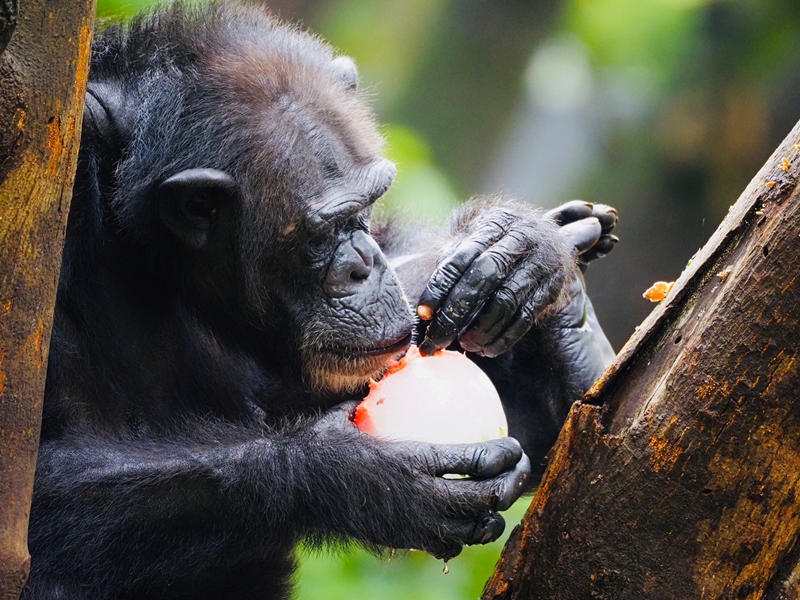 ▲黑猩猩「美珍」大啖榴槤蔬果粽。