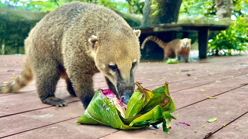 觀光局長高閔琳說,今年端午節緊接在夏至之後,除幫動物們備有夏至冰品外,也特別製作應景的榴槤蔬果粽。她說,這次由園區二位擔任10年以上的志工奶奶吳金葉與洪秀丹協助,以蔬菜為基底,並減量高甜度的水果來降低熱量,以切丁方式將榴槤、酪梨、芭樂、荔枝、芒果、綠葡萄、番茄、胡蘿蔔、火龍果、高麗菜、油菜、玉米等包入月桃葉內,讓動物們品嚐。其中,最懂吃的黑猩猩「莉忠」、「美珍」及「曼華」在等待球冰融化的同時,會先品嚐綁在樹枝上的榴槤蔬果粽,連榴槤的果皮也放入口中咀嚼,絲毫不因榴槤氣味而抗拒,十足吃貨氣勢。對於河馬等大型動物而言,迷你的榴槤蔬果粽,一口完食;另對於味道敏感的非洲象「阿里」則因榴槤氣味直接甩開,讓園方哭笑不得,只好換成一般蔬果粽,讓阿里也能享用應景食物。
