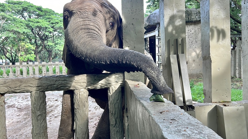 ▲非洲象「阿里」用長鼻想甩開榴槤蔬果粽。