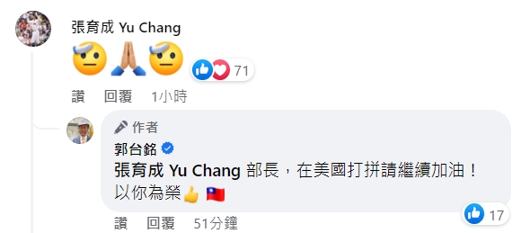 最後,郭台銘表示,蓬萊國小少棒隊目前在日本參加北海道網走交流賽,請各位為這群孩子加油打氣,祝福他們都能赴美國貝比魯斯圓夢,打出最好的成績!而張育成也親自回貼圖對郭台銘表達感謝,郭台銘又再度回文「部長,在美國打拼請繼續加油!以你為榮」