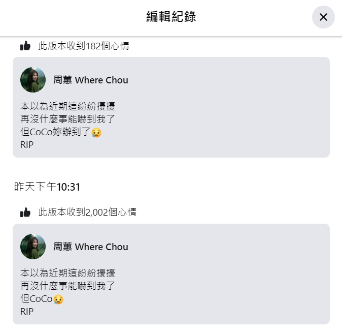 不過周蕙第一時間的發文內容是「本以為近期這紛紛擾擾,再沒什麼事能嚇到我了,但CoCo妳辦到了,RIP」,其中的四個字「妳辦到了」讓網友相當不滿,湧入周蕙臉書大罵她用詞不妥,周蕙也為此重新緊急重新編輯貼文,改成「本以為近期這紛紛擾擾,再沒什麼事能嚇到我了,但CoCo,RIP」。
