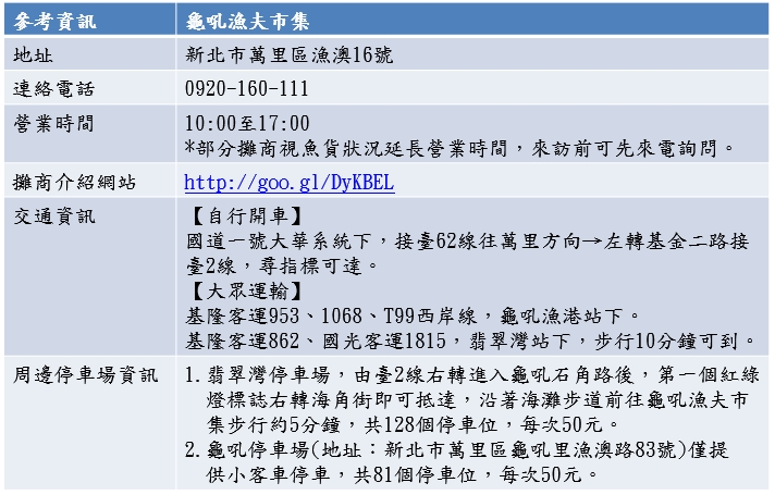新北市漁業處表示,「龜吼漁夫市集」及「富基魚市」皆為北海岸著名的海鮮產地,以在地船家自產自銷新鮮魚貨而聞名,且兩者都是新北特產「萬里蟹」採買聖地。除現撈的新鮮魚貨,還提供代客料理、熱炒及乾貨等,讓遊客吃喝採買一次滿足! 歡迎民眾闔家到新北魚市歡度父親節。