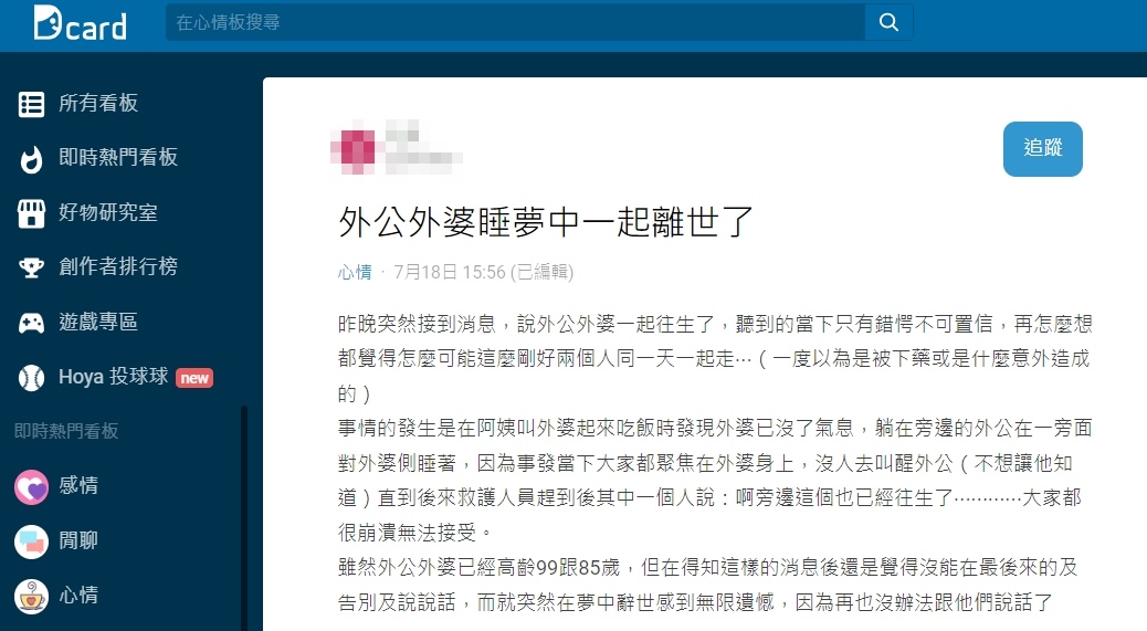 原PO在Dcard心情板發文,表示聽到外公、外婆一起離世的消息,當下只覺得錯愕、不可置信,一度還以為是被下藥或意外,但其實兩人是在睡夢中安祥的過世。