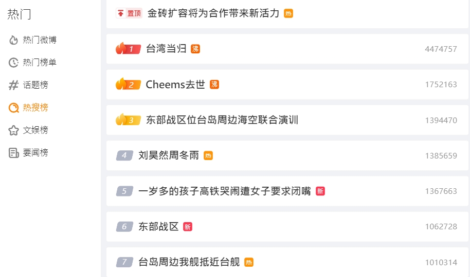 今日中國大陸微博熱搜第一出現「台灣當歸」、「東部戰區位台島周邊海空聯合演訓」、台島周邊我艦抵近台艦」等話題,前7條就有4條相關,中國官媒《人民日報》也發文強調「台獨」是歷史逆流,是絕路。