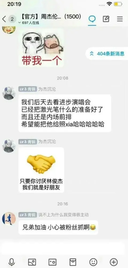 此時網路上流出一張群組對話截圖,一名暱稱「為杰沉淪」的網友在周杰倫官方群組放話說要去看林俊傑演唱會,座為是內場前排,已經把雷射筆準備好了「希望能把他給照瞎」,截圖流出讓網友相當傻眼,相信周杰倫也會譴責這樣的行為。