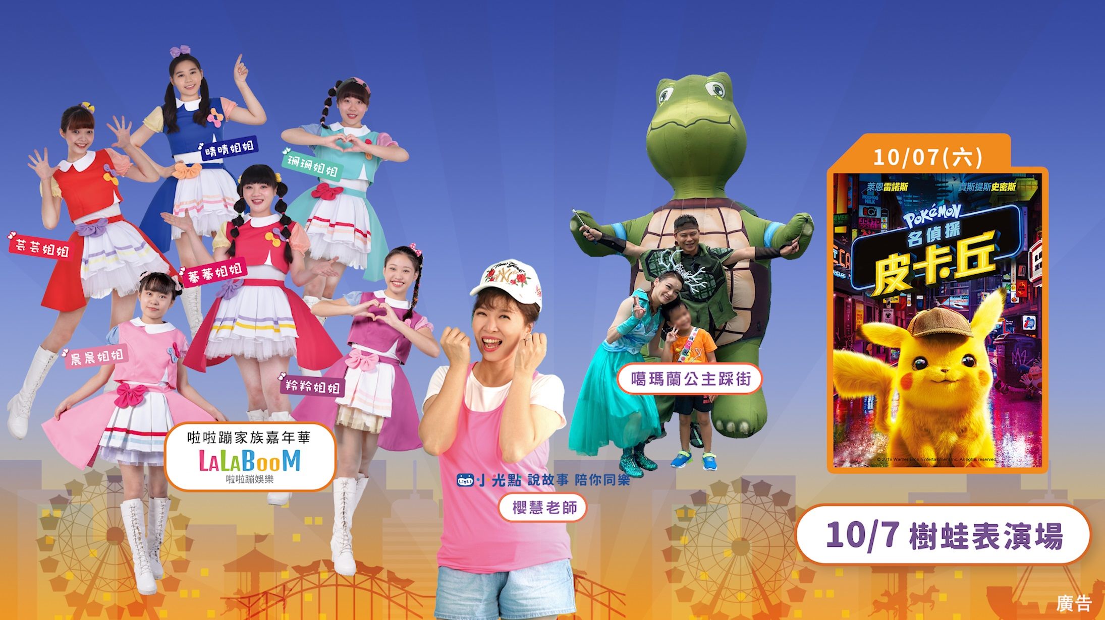 10月7日18時,「名偵探皮卡丘」開演,一隻會說話的皮卡丘與他的搭檔攜手解開謎團,展開一場刺激的偵探冒險旅程。10月8日,則是小朋友們最喜愛的漫威超級英雄電影「蜘蛛人穿越新宇宙」,蜘蛛人與女蜘蛛人聯手穿越多重宇宙,努力尋找自己的定位與目標;10月9日,「尖叫旅社變形怪獸」壓軸演出,吸血鬼變成人類、人類變成怪獸,他們必須想辦法將自己變回原來的樣子,劇情幽默爆笑。