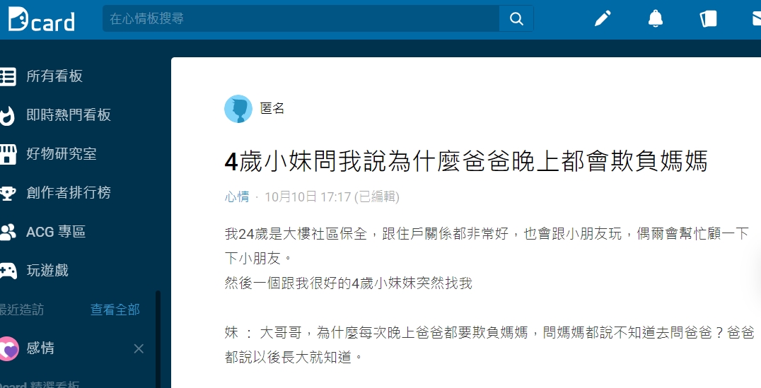 保全在Dcard心情板發文表示,自己跟住戶的關係都不錯,也會跟小朋友玩,有時還會幫住戶顧小孩。