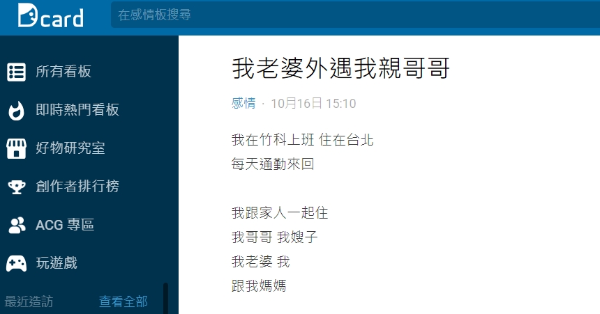 原PO在Dcard感情板發文表示,看到老婆全身赤裸走進房間那一刻,他就暴怒了,隨即衝到哥哥的房間打開房門,對著哥哥一陣痛罵。他的哥哥被罵竟然還對他說:「不然我老婆也給你弄!」