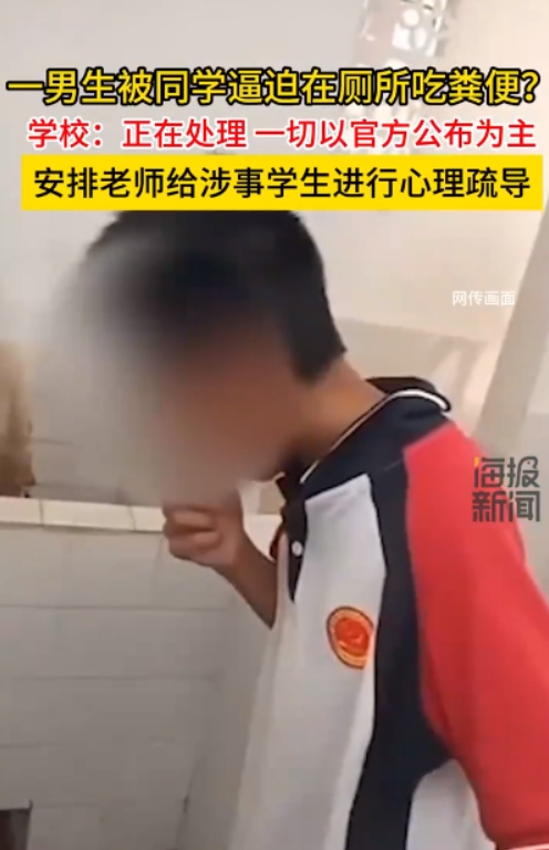 中國大陸傳出一名中學男學生被同學霸凌,被要求吃大便,霸凌他的人還拍下影片PO網!校方回應已著手查詢,確認這件事是真的,已經對被霸凌的學生進行心理輔導。