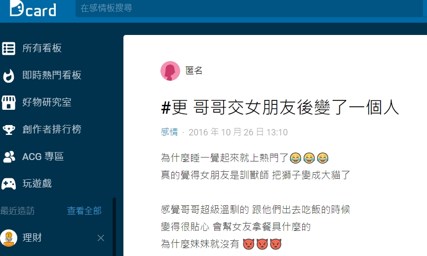 原PO在Dcard感情板發文表示,「哥哥在交女朋友之前他的房間就跟被炸彈炸過一樣,垃圾亂丟衣服亂丟,有蟑螂是最基本的,反正就是生活習慣很糟糕啦!而且廁所都會積一堆水垢啊、尿垢什麼的,還有哥哥是獅子座,超級大男人!」
