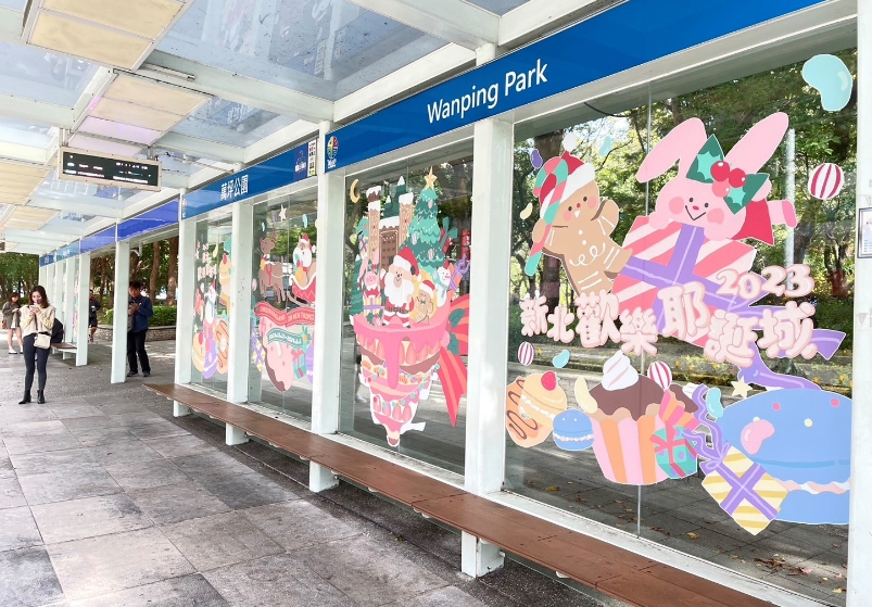 此外,在板橋文化路一段的板橋車站和萬坪公園的公車候車亭也添妝主題彩繪和燈飾,化身為「甜點派對候車亭」,讓候車乘客沈浸在新北耶誕城歡樂甜點世界的氛圍中。