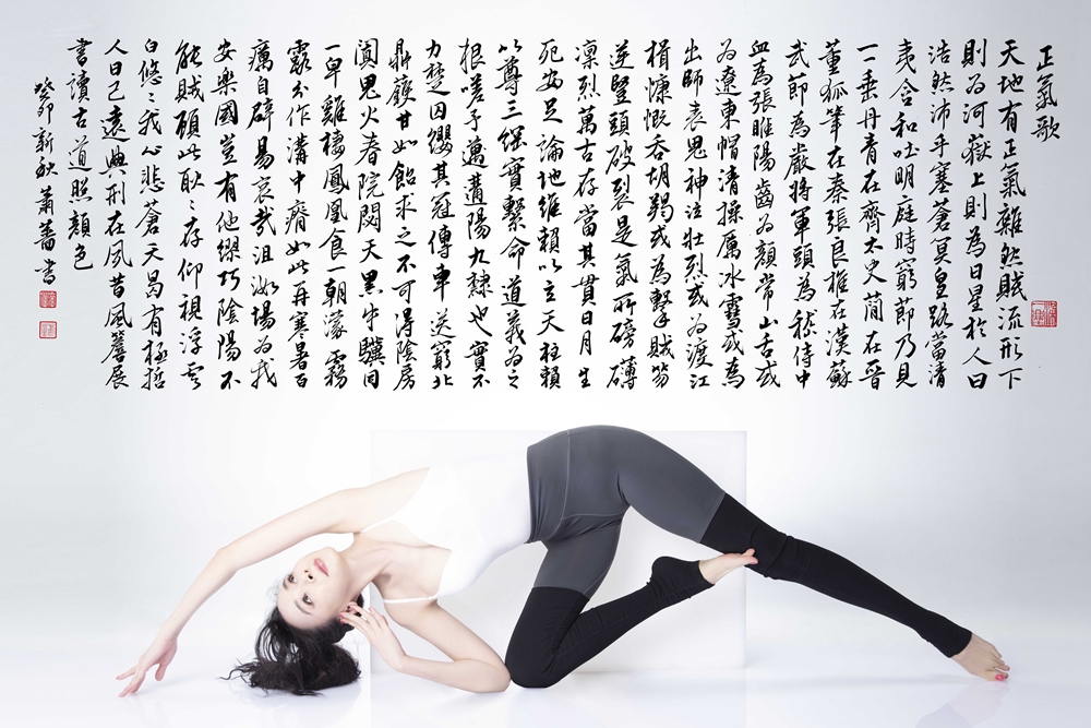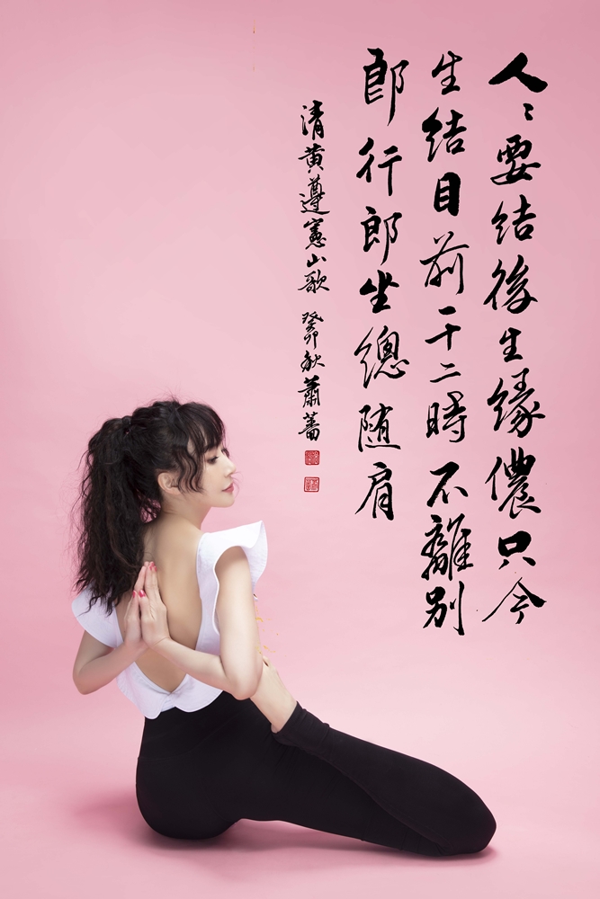 至於多年從不間斷的瑜珈、書法,今年也克服了肩膀和手的疼痛,繼續展現更多高難完美的體式,蕭薔說:「身體的疼痛,是更能了解體式的邊界」,書法、瑜珈、詩詞、美人融合在一個畫面裡的「正氣歌」,她笑說:「有靈氣的女子必有一身正氣」。