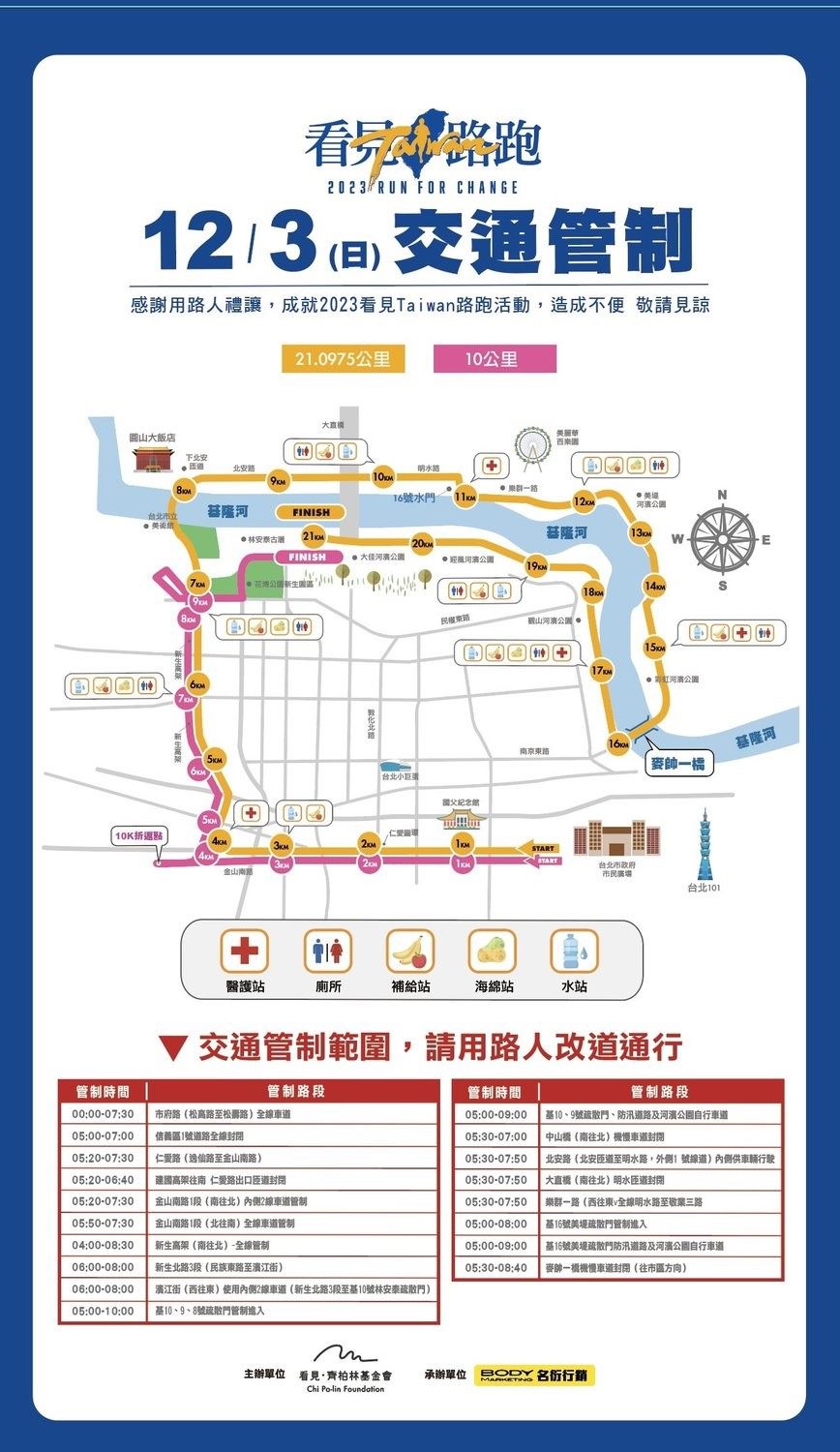 齊柏林基金會訂於112年12月3日(星期日) 5時至10時,假本市市民廣場(起點)及大佳河濱公園(終點)舉行「2023看見Taiwan路跑」活動,為維護交通秩序與活動安全,臺北市政府警察局將實施交通管制,禁止車輛通行,管制路段及時間如下: