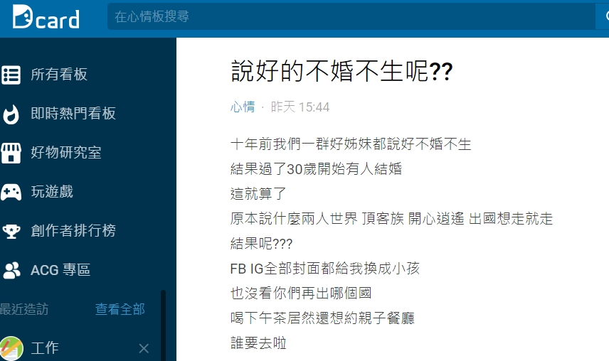 原PO表示,過了30歲結婚的好姊妹一開始說只是要過兩人世界、當頂客族,可以過得開心又逍遙,出國也可以想走就走,結果竟然生了小孩,臉書和IG的封面全部換成小孩的照片,也沒有看過她們再出國,而且和姊妹喝下午茶竟然還要約親子餐廳,讓她忍不住抱怨,到底誰要去親子餐廳喝下午茶啦!