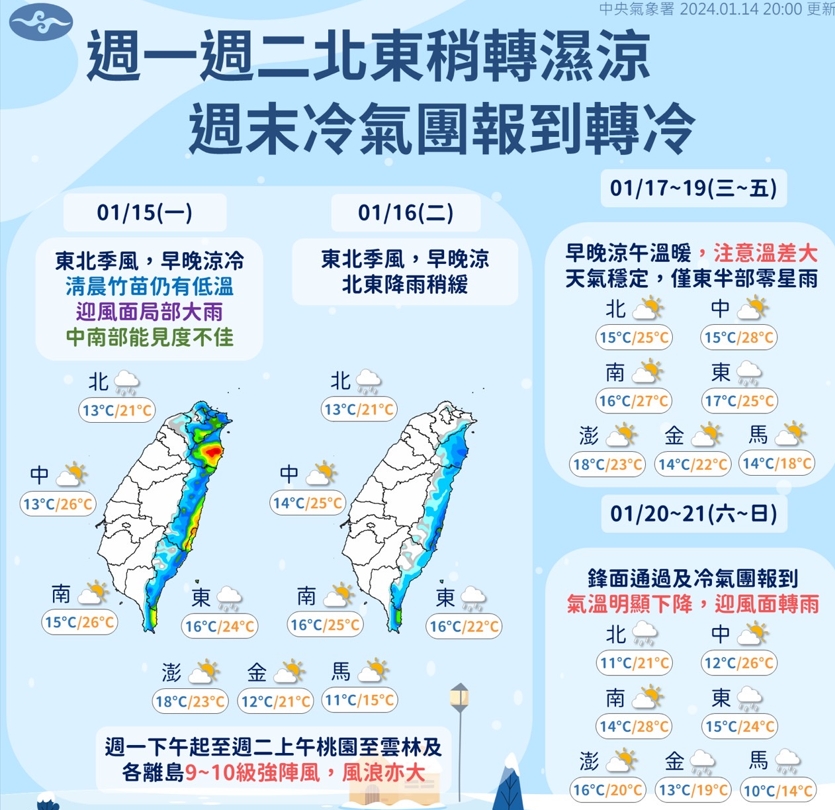 今明兩天(1/15、1/16)北台灣及東部稍轉濕涼意,今天尤其受到東北季風影享,迎風面有局部大雨機率,中南部能見度不佳。️台灣大學天氣研究團隊執行長林得恩表示,21日將迎來2024年最強冷空氣,將會連凍5天。