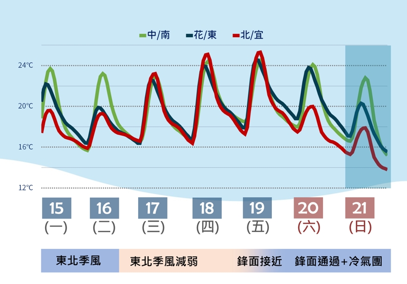 中央氣象局署表示,今日北部和東部地區局部雨勢較大,明天依舊受到東北季風影響,日夜溫差大,但降雨會比今天稍緩。週三(1/17)開始一連3天溫差依舊很大,但天氣較為穩定,只有東半部地區有零星降雨。