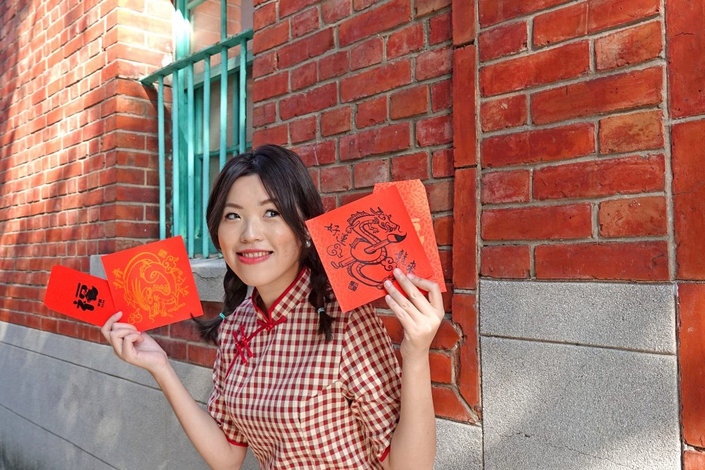 前者是龍拿著翟與籥(翟ㄉ一ˊ:用雉尾羽毛作成的飾物;籥ㄩㄝˋ:竹子做的樂器,外型跟笛子相仿。祭祀孔子誕辰時,佾生左手執籥,右手秉翟獻舞)以生龍活虎的精神來迎接春節的到來;後者則是正在舞動身體運筆的龍,象徵好運龍來,展現生機蓬勃的氣息。福「龍」紅包袋,巧妙的將龍形圖案融入福字當中。藉由體驗版印的趣味,將心意注入其中,創造個人專屬的斗方和紅包袋。