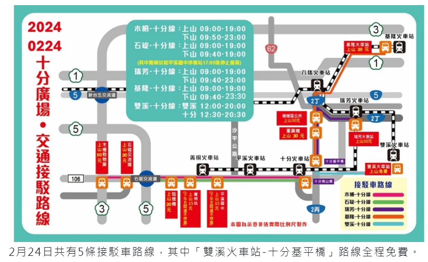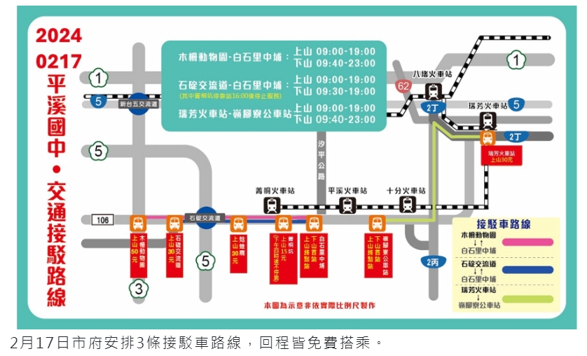 活動兩日往會場接駁公車收費採上車收費,2月17日(六)從木柵上車收費50元;從石碇交流道、姑娘廟、瑞芳火車站上車收費30元;從菁桐坑上車收費15元;2月24日(六)從木柵上車收費50元;從石碇交流道、姑娘廟、瑞芳火車站、基隆火車站、暖暖區公所、東興廟上車收費30元;從菁桐坑及平溪國中上車收費15元。兩日回程搭乘接駁車下山皆免收費。2月24日(六)接駁路線「雙溪火車站—十分基平橋」則全程免費,歡迎民眾多加利用。另接駁車不適用行政院TPASS月票優惠。