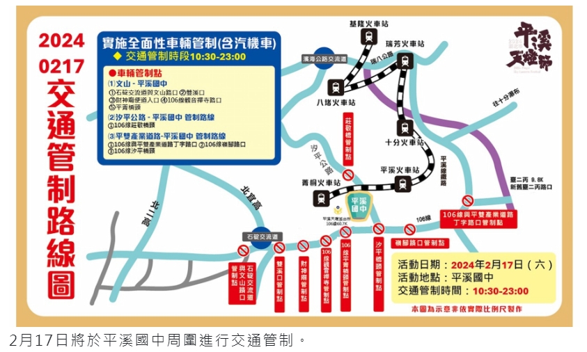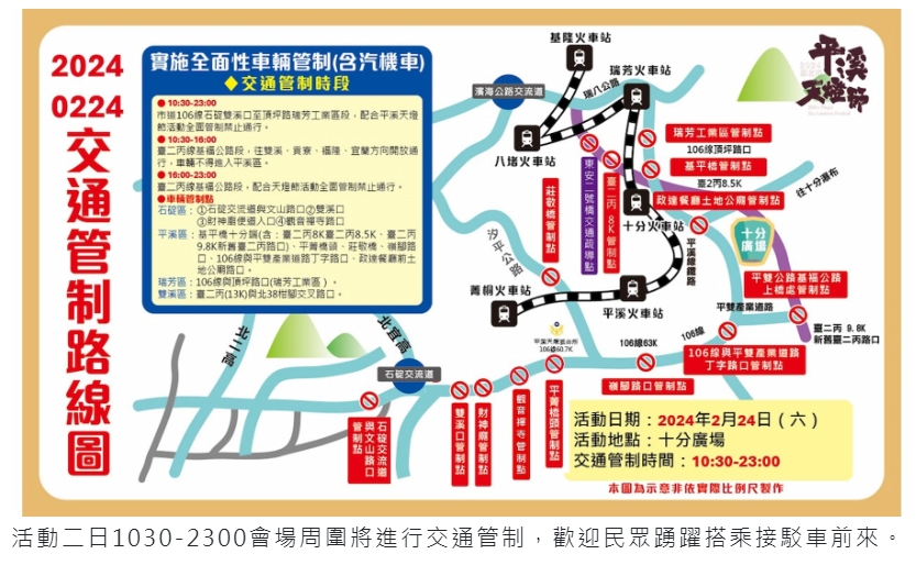 「2024新北市平溪天燈節」將於2月17日(六)平溪國中、2月24日(六)十分廣場龍重登場!為維護場域安全及因應大量人潮,讓民眾有更順暢、開心的遊程體驗,兩場活動當日10時30分至23時將實施周邊場域交通管制與提供接駁公車服務,特別安排多條路線接駁車,並與臺鐵公司協調加開或加掛車輛,呼籲前往活動的民眾利用大眾運輸工具前往會場。新北市政府觀光旅遊局局長楊宗珉邀請民眾參與今年新北市平溪天燈節活動,一起祈福、豪運龍來!