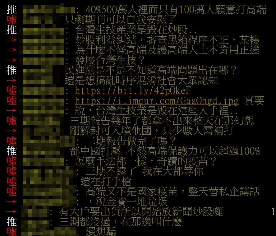 PTT八卦版鄉民超級火大,紛紛留言表示「三期報告出來了?」、「自慰真的很爽」、「死亡率不是最高嗎!」、「真強快外銷,拜託」、「台灣生技產業已經被藍白弄垮了」、「服從黨就從高端開始」、「也只有你們自己會信了吧」、「一個三期沒過的,要國人挺,哪可能」、「沒有三期報告結果還有一堆假業務在護航」、「沒有三期報告。一支都賣不出去國外」、「炒股利益糾結,審查黑箱程序不正」、「民進黨是不是不知道高端問題出在哪」、「還想騙」。
