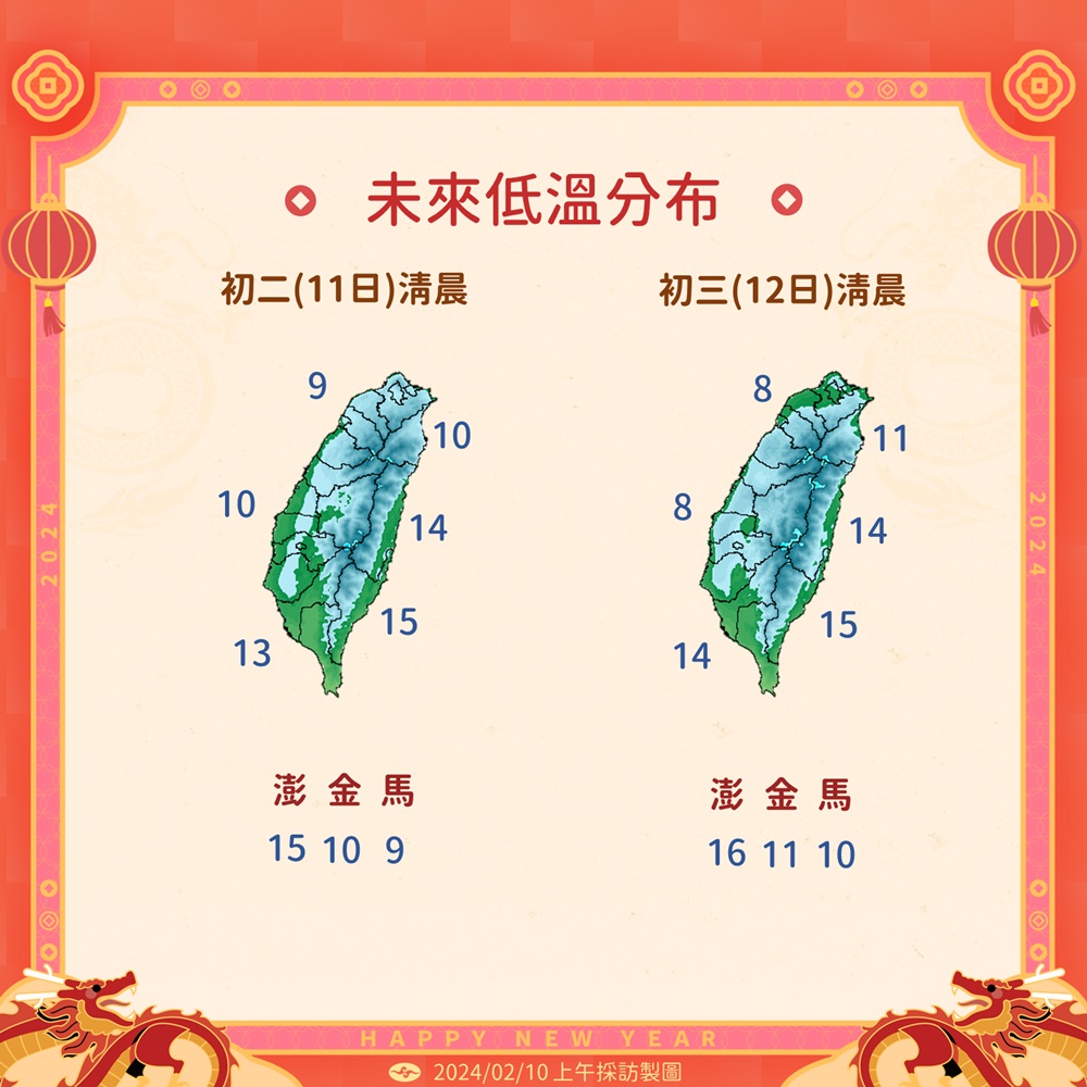 不過入夜後要注意會再有明顯的降溫,由於雲量減少、輻射冷卻效應會變得更明顯,預估出現10度或以下低溫的範圍有擴大趨勢。