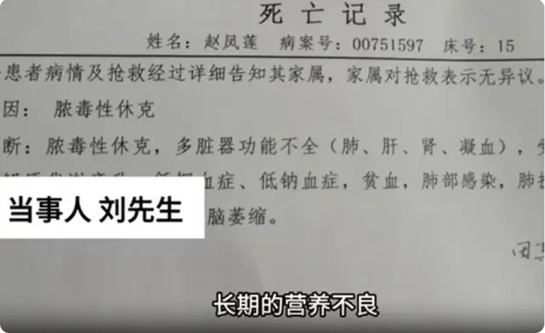 但是醫生當場對劉男說,他母親「長期營養不良」、「5根肋骨骨折,斷骨時間可追溯回7月份」,診斷書的內容寫著「多重器官功能不全,低血鉀、低血鈉,胸腔積水和肺部炎症,感染性休克、壓力性損傷」等等。