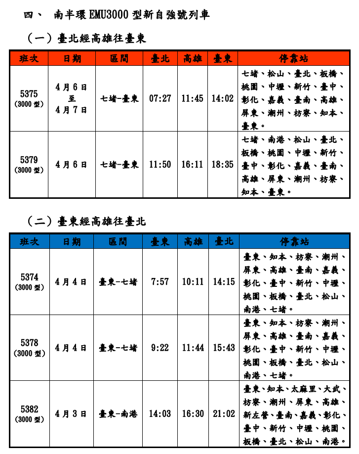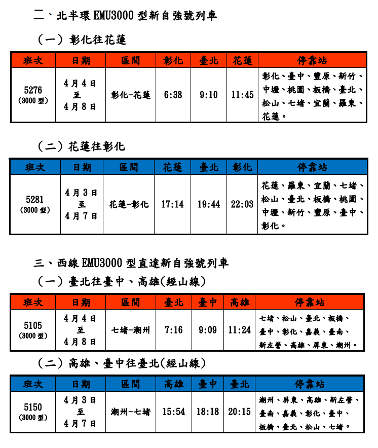 台鐵公司表示,從4月3日開始到4月8日共計6天,全線加開各級列車共計155班,其中包含東部地區實名制列車6班、彰化-花蓮北半環EMU3000型新自強號列車10班、七堵-台東南半環EMU3000型新自強號6班、七堵-潮州EMU3000型新自強號直達車10班、湖口-台東EMU900型區間快車8班。