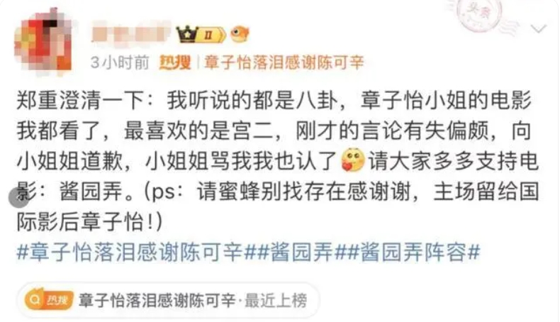 昨日(3/12)《醬園弄》殺青宴影片全網瘋傳,一位微博博主發文表示,楊冪會出演這部電影,是因為章子怡認知到自己票房很差,所以才特意請陳可辛找來楊冪,想要蹭楊冪的熱度,因為只要有楊冪在,票房就會好,其實最大的贏家、最聰明的人是章子怡。