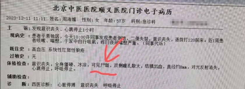 周海媚被送到醫院時,醫生檢查發現她意識喪失,全身僵硬冰涼,可見屍斑,雙側瞳孔放大,結膜靜脈,心跳硬,呼吸停止。