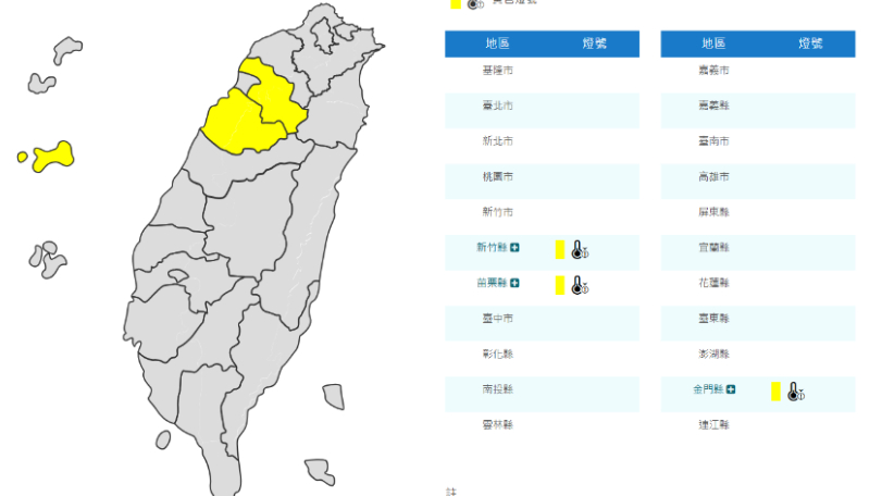 氣象暑表示,由於受到大陸冷氣團及輻射冷卻影響,各地氣溫明顯偏低,今天晚上到明天清晨,新竹、苗栗及金門局部地區有10度以下氣溫(黃色燈號)發生的機率,請注意。