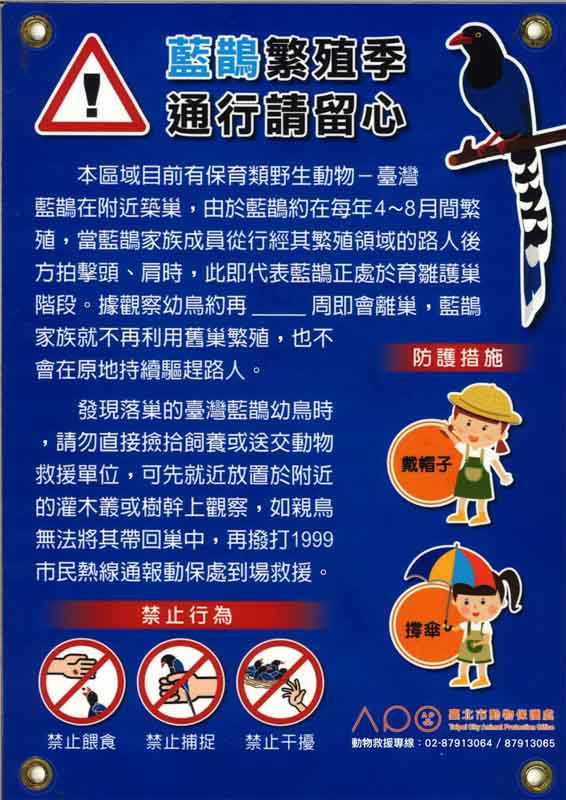 動保處在接獲民眾通報台灣藍鵲有驅離路人的行為時,採取不移除藍鵲巢雛,改以張貼告示的「就地保育」原則提醒大家避開繁殖區域,或用撐傘或戴帽子的方式路過,也要避免撿拾落巢幼雛,請民眾共同營造友善藍鵲的生態環境。