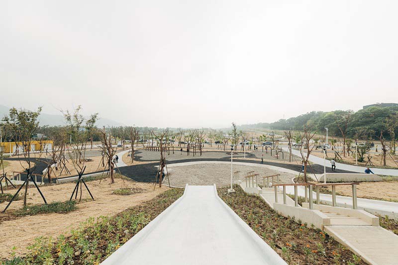 劉振宇指出,在生態保育及水資源再利用方面,由於基地內有保護物種台灣大豆,所以在施工前特別先進行採種復育,並設置台灣大豆保留區、原生樹種造林區、坡腳造林植生區,透過生態補償措施進行生態復育,完工後也可增加約40公頃的綠化面積。此外,景觀土丘的自動噴灌系統,水源抽取自中央水道,而共融式遊戲場下方也設有一座55.7公噸的水撲滿,蒐集雨水做為廣場植栽灌溉水源,估計每年可節省約27萬元的自來水費。