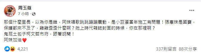 針對里長的行為,媒體人周玉蔻也出面力挺張惠妹,她說:「那個什麼里長,以為你是誰,阿妹唱歌跳跳蹦蹦震動,是小巨蛋當年施工有問題!張惠妹是國寶,保護都來不及了,雞雞歪歪什麼啊?」