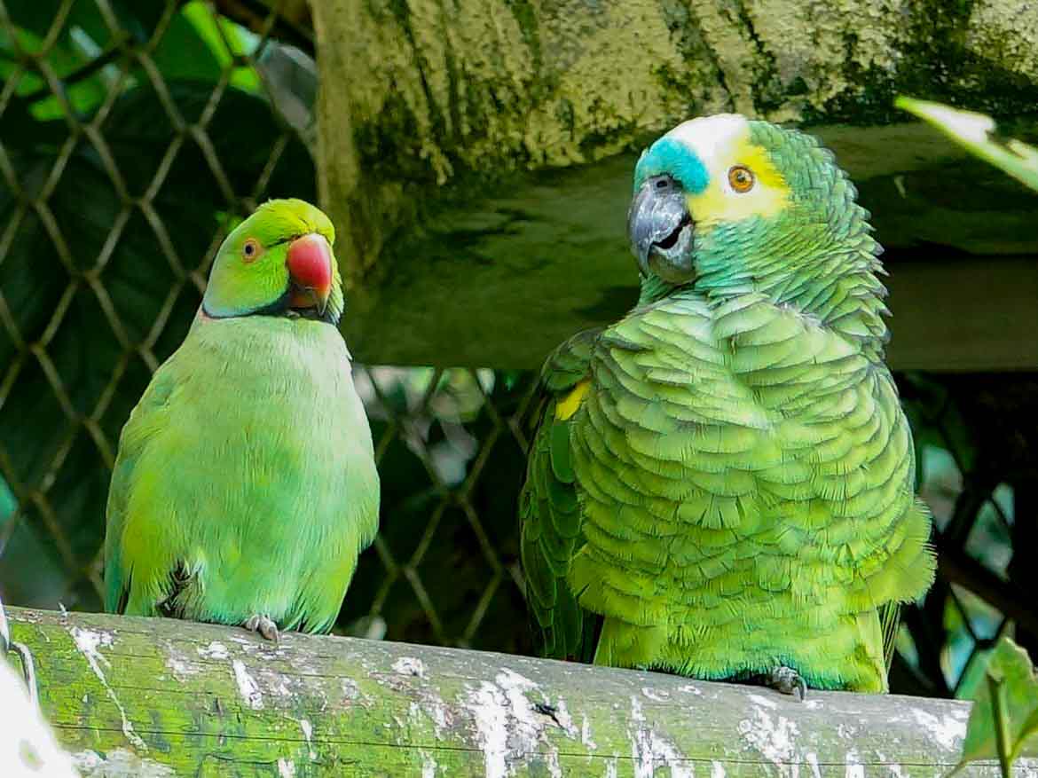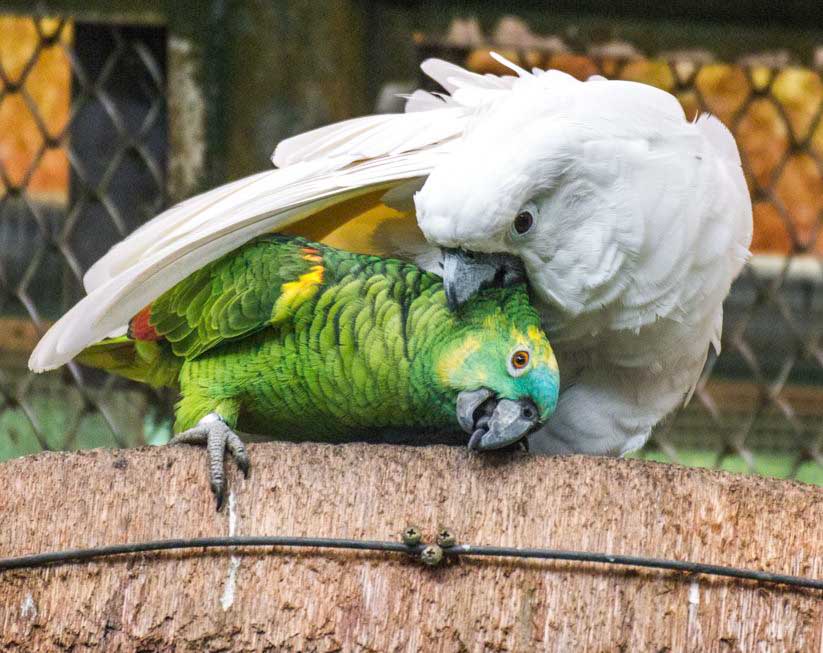 動物園裡的鸚鵡種類及數量繁多,為了強化動物福祉,提供鸚鵡們「社交多樣性」的環境,保育員刻意分開一部分同種類的鸚鵡避免牠們拉幫結派,並安排不同種甚至體型差距大的鸚鵡共用一個活動場,製造重疊的空間來促進交際,例如調整每日供給食物的品項以限縮食盆的數量,讓牠們有更多互動機會,在持續變動的環境刺激下維持社交平衡。